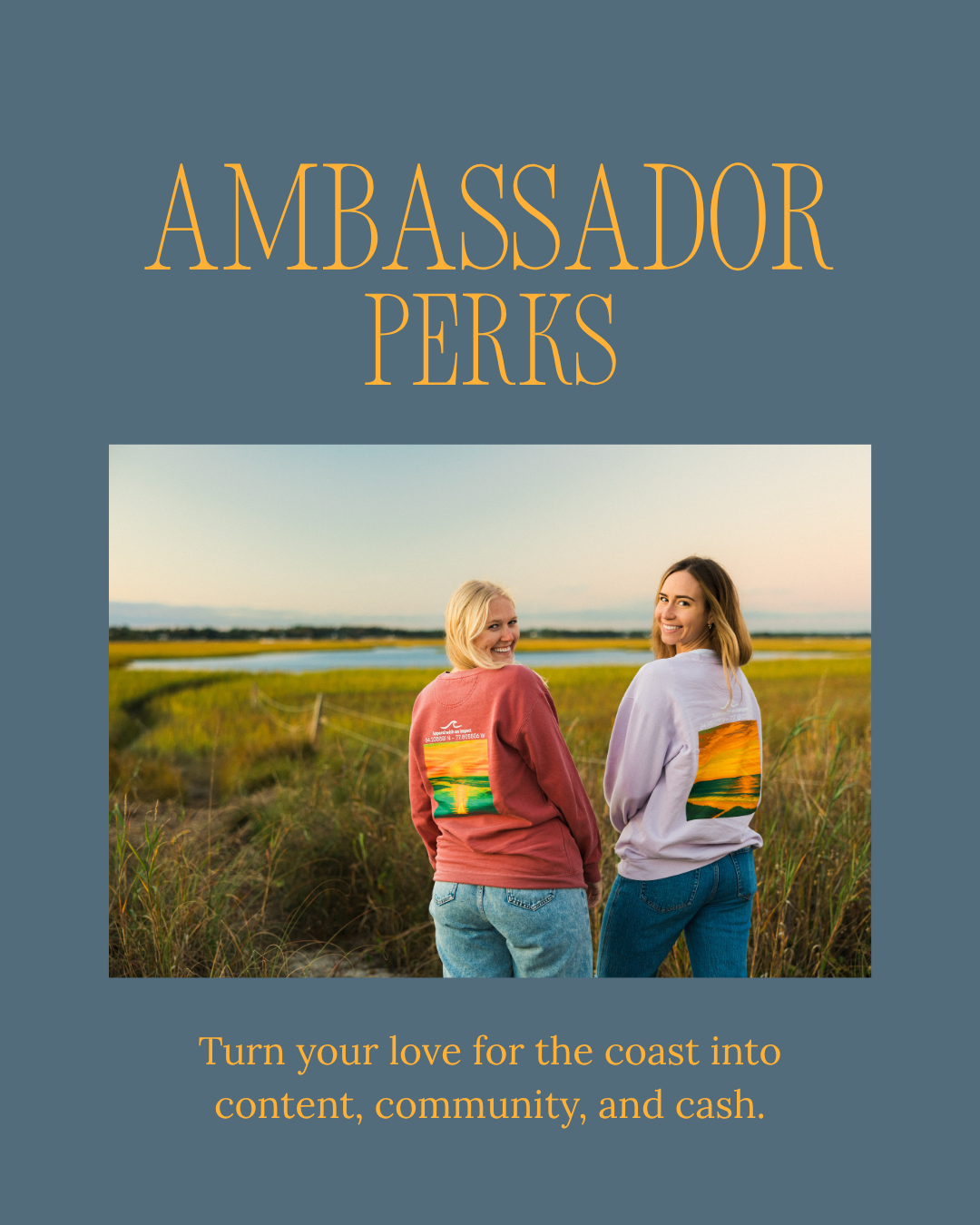 As a Soundside Collective Ambassador, you’ll get free merch, create content that celebrates the coast, and earn cash every time someone shops with your referral code. You can even earn more by referring new ambassadors to the program.